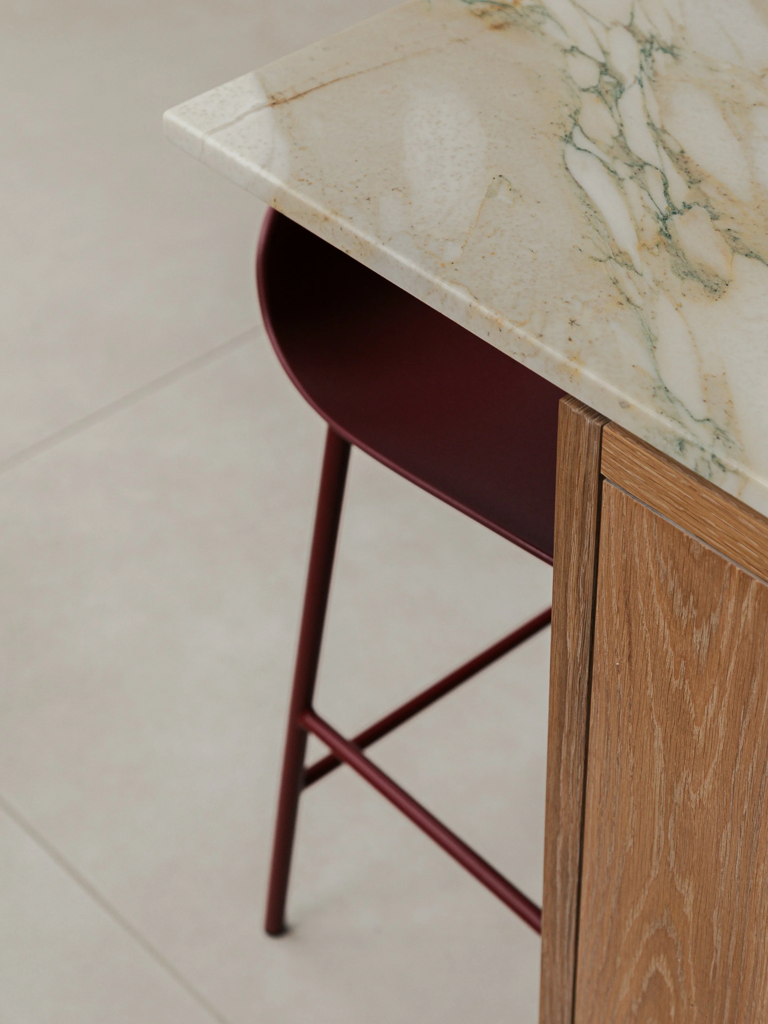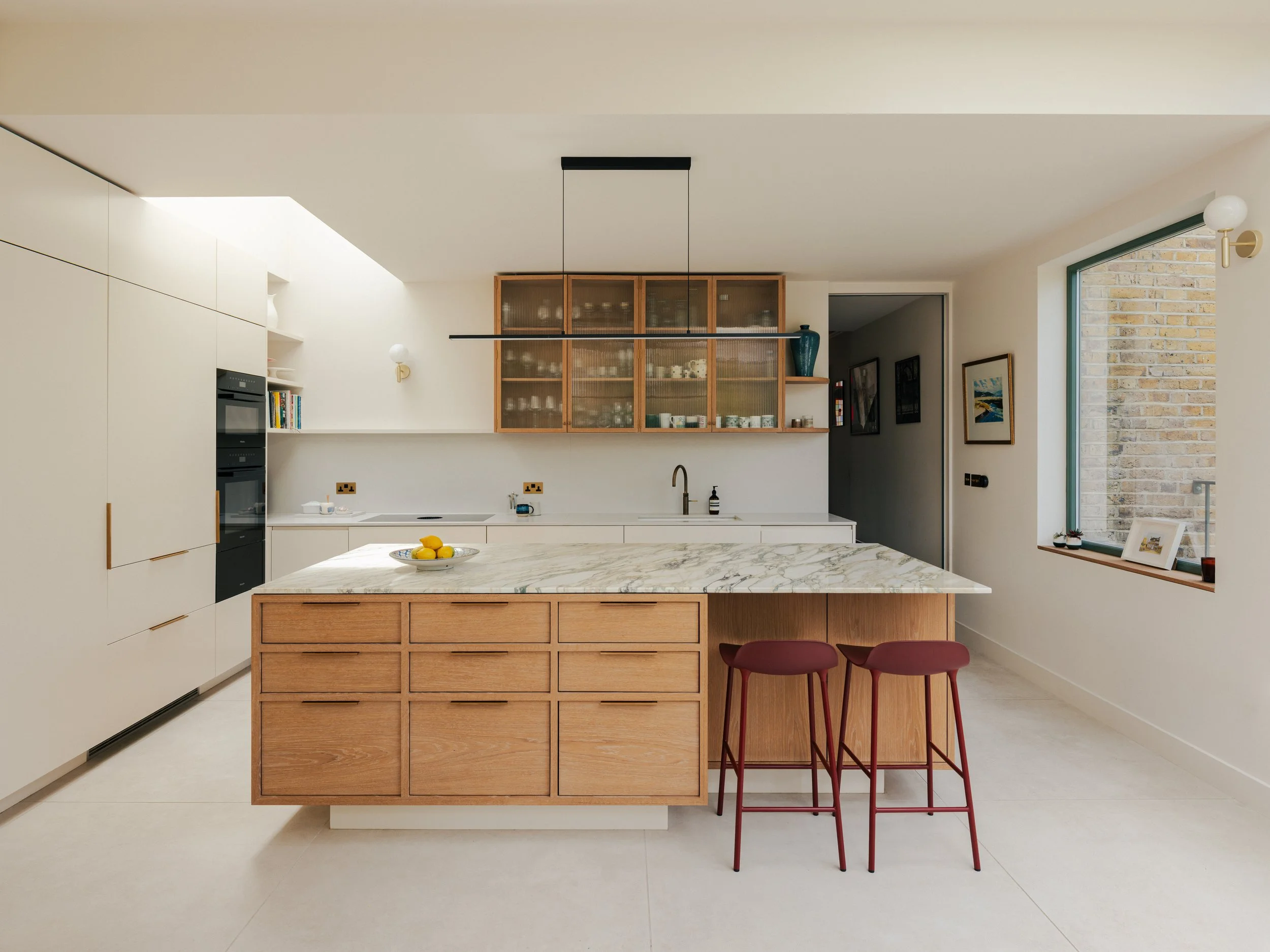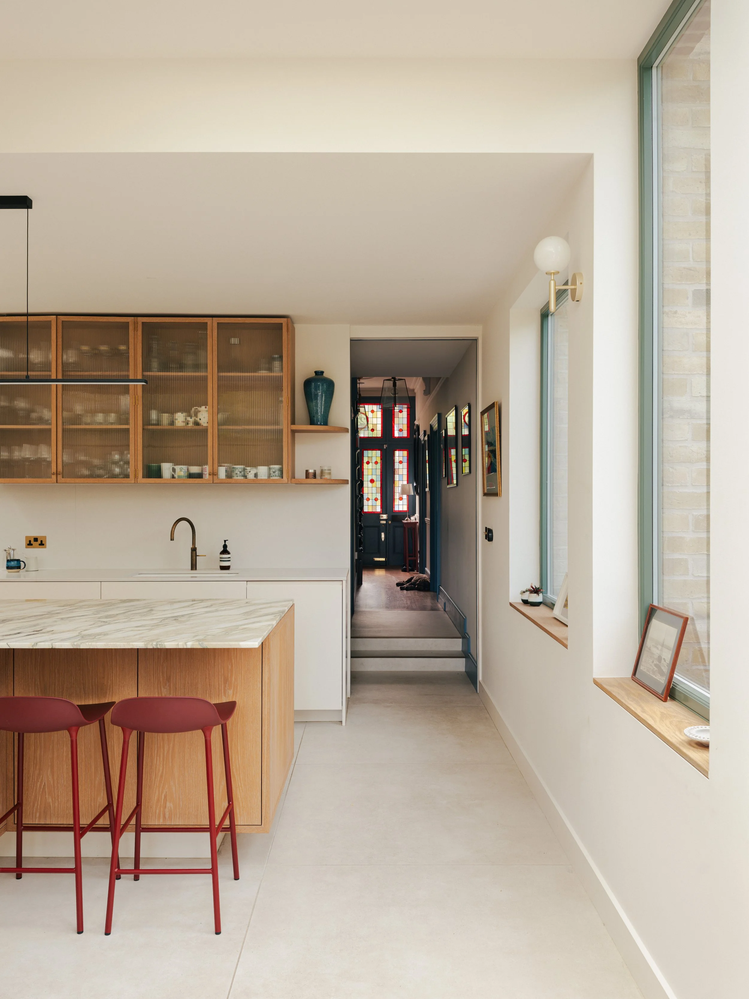 The changes included a new basement level and a rear extension, allowing us to redesign the kitchen and living areas. The old kitchen was cramped and disorganized, with little room for dining. Now, it’s a much more usable and enjoyable space, with wide views over the garden that feel open but still cosy. A built-in dining bench next to the garden windows gives the family a spot to share meals when schedules allow — or simply enjoy a quiet morning coffee.