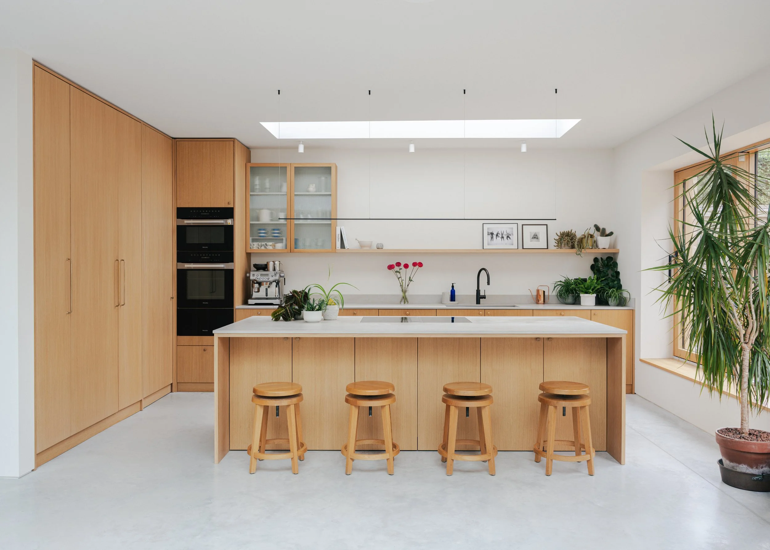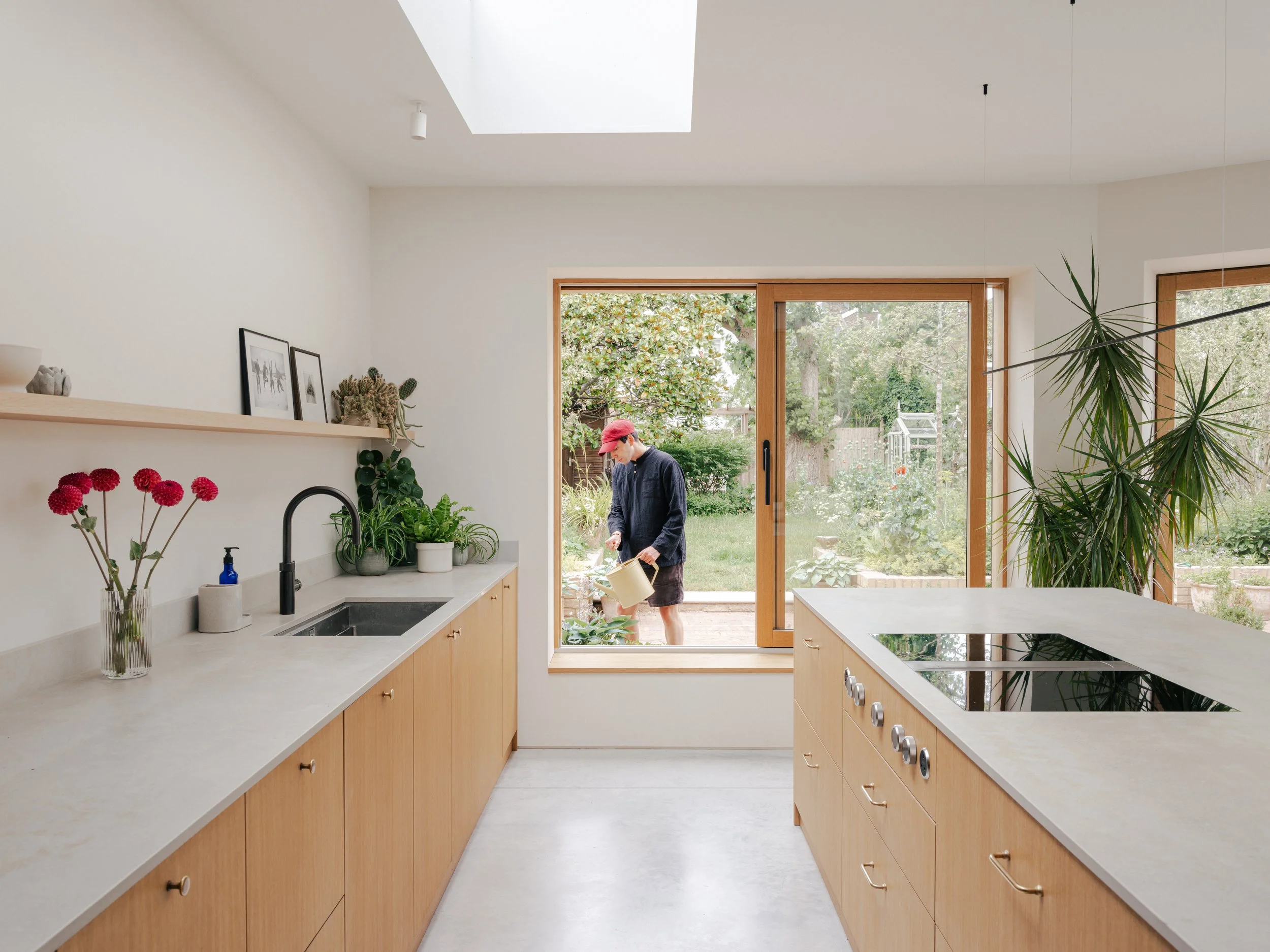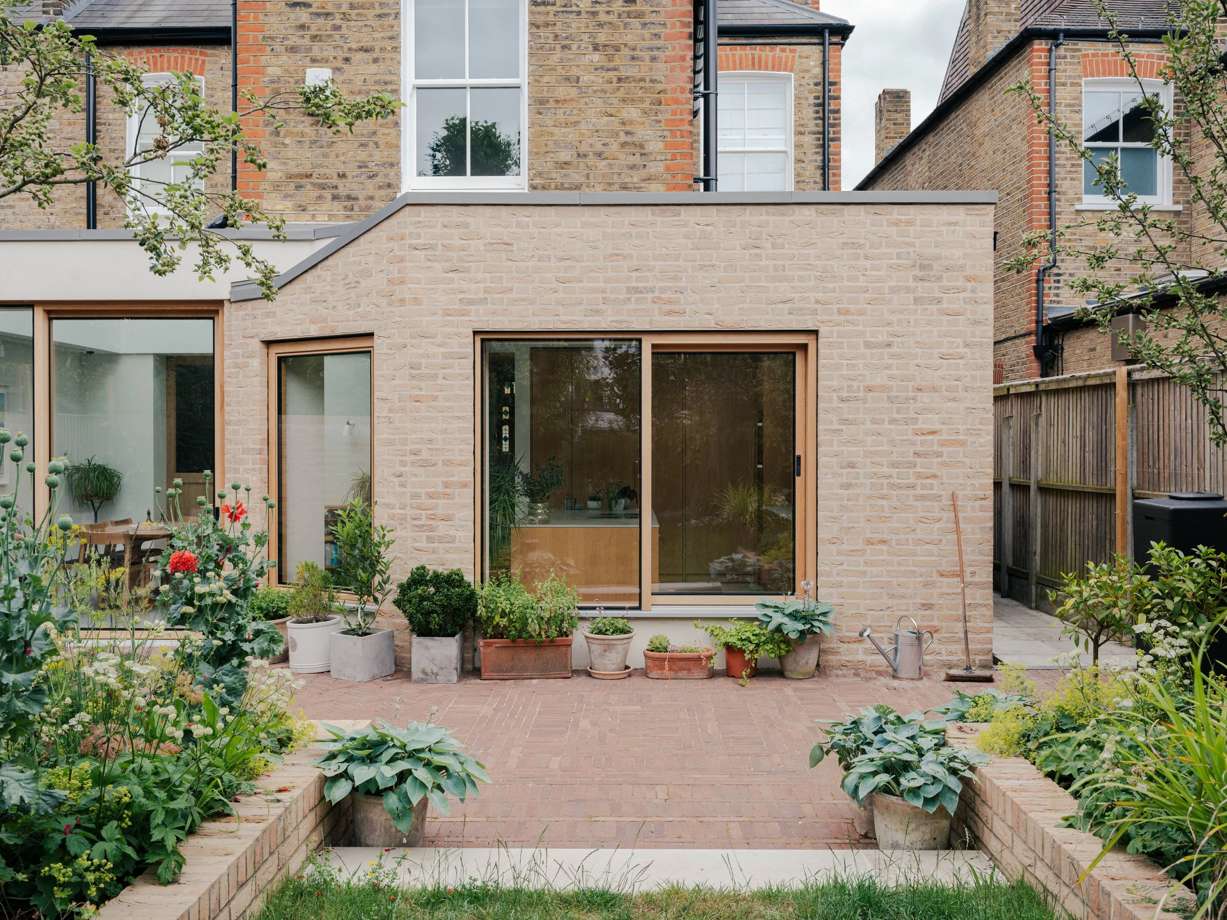 A brick ‘arm’ of the extension folds back towards the original house, housing the kitchen with a large sliding window overlooking the garden. Adjacent to it, a lighter-weight render and glass volume replaces the failing infill extension. The junction between these two new volumes forms a carefully crafted corner window seat, which not only softens the geometry of the rear elevation but also offers diagonal views into the garden and frames the landscape from the moment you enter the house through the front door.